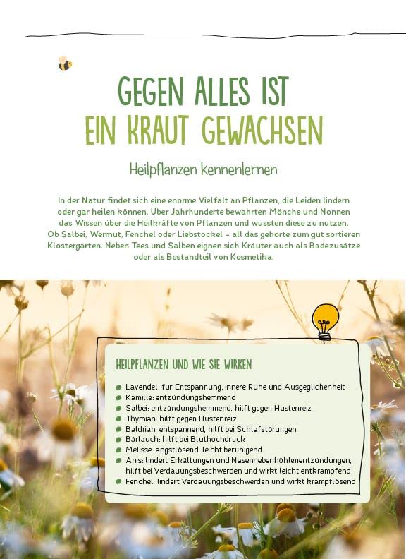 Das Buch „Wald, Wiese & Insekten“ von den Umweltprofis Marie und Nick nimmt die Kinder mit auf eine spannende Entdeckungsreise in die Natur. Die Kinder begeben sich auf die Spuren der großen und kleinen Tiere in unserer Umwelt und lernen ihre Lebensräume im Wald und auf der Wiese kennen. Außerdem erfahren sie, welche Tiere und Pflanzen als Vorbilder für geniale Erfindungen dienen. Dieses Buch vermittelt nicht nur umfangreiches Hintergrundwissen, sondern regt auch mit witzigen Funfacts und zahlreichen Anschauungsbildern zum Staunen an.
